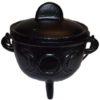 Simple, plain cast iron cauldron w/ lid making a useful, safe burning tool.Cast iron 5″ high x 4 1/2″ wide.