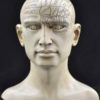 This antiqued human head has distressed words, symbols and mapped areas relating to the pseudoscience of phrenology.